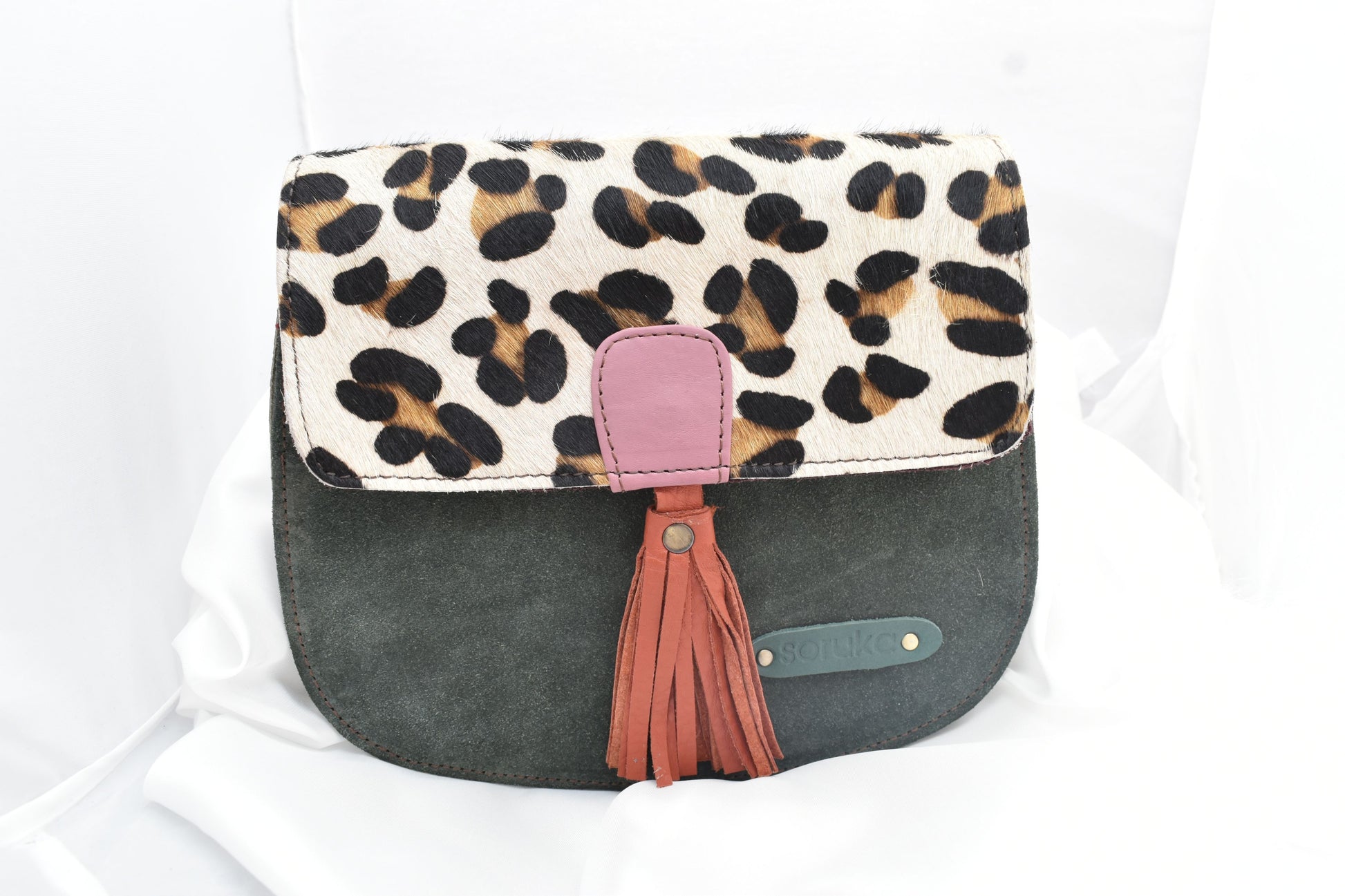 Χειροποίητη σουέτ γυναικεία τσάντα. Κάθε τσάντα είναι ένα μοναδικό κομμάτι, συναρμολογημένο στην Ινδία με ένα έργο δίκαιου εμπορίου για την ανάκτηση δερμάτινων απορριμμάτων, ακόμη και ο ιμάντας, το πίσω μέρος της τσάντας και οι εσωτερικές θήκες συναρμολογούνται με δέρματα διαφορετικού χρώματος.